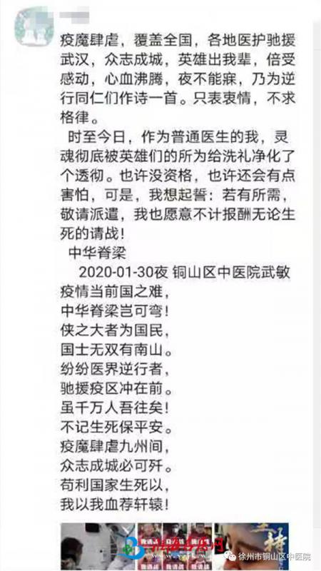 近期,因为全国新型冠状病毒肆虐,铜山区中医院全面发动党员干部积极走在前列,为全院员工做表率的号召,武敏主任虽然是民主党派、九三学社社员,但是她第一个发起了请战书,而且多才多艺的武主任还自己原创了一首热情洋溢的疫情抗战诗,让人看的热血沸腾,小编真心为铜山区中医院有这样的员工而感动的热泪盈眶。