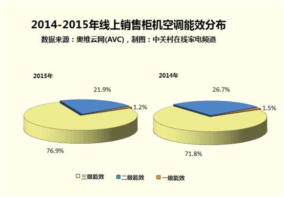据网络一文显示,根据奥维云网(AVC)提供的大数据显示,在电商平台中,2015年线上销售产品中,挂机中一级能效产品占比为0.5%,二级能效产品占比为5.5%,三级能效产品占比为94%。而在2014年,一级能效占比为0.8%,二级能效占比为9.2%,三级能效占比为90%。那么,电商中柜机产品能效等级占比又是如何呢?在2015年线上空调市场中,柜机中一级能效产品占比为1.2%,二级能效产品占比为21.9%,三级能效产品占比为76.9%。相比2014年,一级能效产品占比为1.5%,二级能效产品占比为26.7%,三级能效产品占比为71.8%。