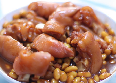 原料:猪蹄3个,黄豆100克,姜片25克,五香粉、盐、酱油、香油适量。