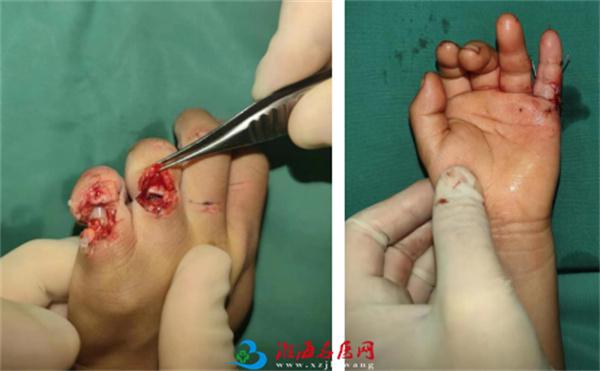 术中探查见男童左小指近节近端不全离断,近节指骨骨折,指伸肌腱完全断裂,指深指浅屈肌腱不全断裂,环指指伸肌腱两处完全断裂,骨断端及外露骨质布满黑色油污,局部骨质热磨伤变性。术中彻底清创后,将骨折复位内固定,伤口内探查见左小指双侧指动脉、左小指双侧指神经断裂。断指血管外径约0.5毫米,血管内径约0.3毫米,常规显微外科难以吻合,采用超级显微技术予以吻合血管断端,小指通血成功。断指再植对时间有特殊要求,“黄金6小时”内越早再植,断指成活率越高。利用超级显微外科技术,并在超级显微镜辅助下,将手术时间缩减,再植成活机会成倍增加。