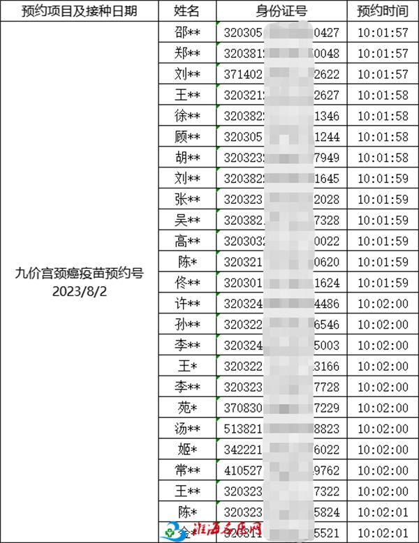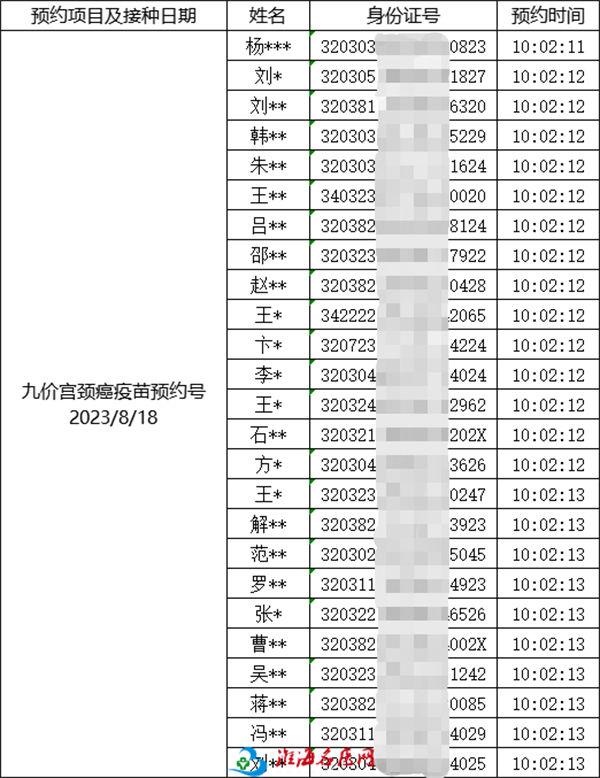 徐州市妇幼保健院成人预防接种门诊 7月31日宫颈癌疫苗线上预约成功名单公示