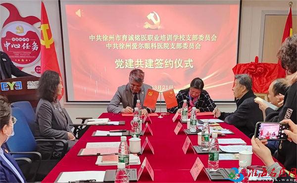 3月21日下午,中共徐州爱尔眼科医院支部委员会与中共徐州市育诚铭医职业培训学校支部委员会开展结对共建活动。旨在进一步探索、创新党建工作方式,以共建促党建,努力形成互带互动、优势互补、共同发展的基层党建工作新格局。