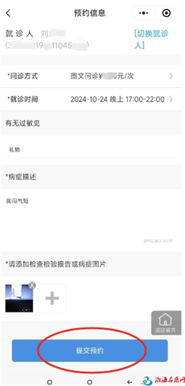4.在“医生主页”界面选择问诊时间后,确定“就诊人”并根据自身情况在图文、语音、视频三种问诊模式中选择一种,填写病情描述并上传相关资料的图片,点击“提交预约”即可,等待医生线上接诊回复。