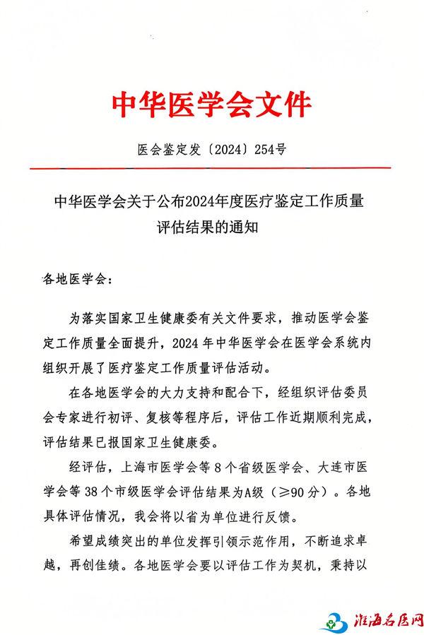 在2024年度全国医疗鉴定工作质量评估中,徐州市医学会以优异的成绩荣获评估最高等级A级。