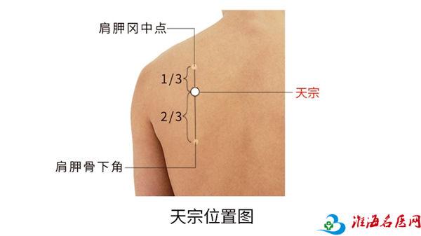天宗穴位于肩胛区,肩胛冈中点与肩胛骨下角连线的上1/3与下2/3交点凹陷中,正坐垂肩取穴。