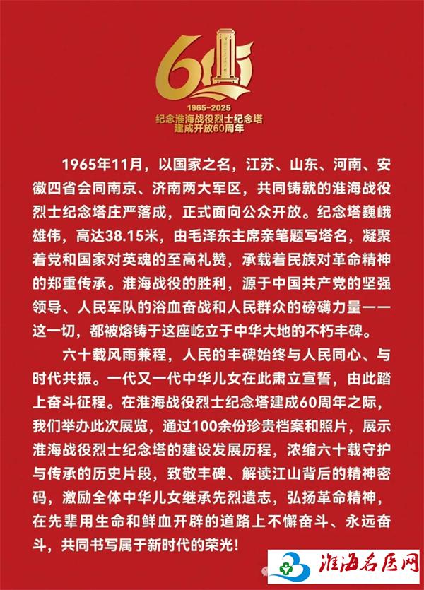 甲子轮回,丰碑永铸。为隆重纪念淮海战役烈士纪念塔建成开放60周年,值此国庆佳节来临之际,我们隆重推出“人民的丰碑”主题图片展,重温这座巍峨身影背后六十年的光辉历程。展览将于9月30日烈士纪念日当天,在淮海战役烈士纪念塔塔前平台、苏宁广场、淮塔地铁站三地同步隆重启幕。