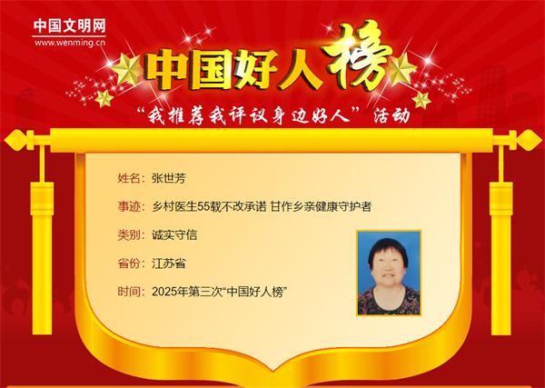 经各地推荐、网友评议和专家评审等环节,全国共有138名助人为乐、见义勇为、诚实守信、敬业奉献、孝老爱亲身边好人光荣上榜。其中江苏有10人,徐州乡村医生张世芳光荣在列。