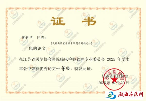 学术荣誉丨徐州一院蒋新华荣获省医院协会临床检验管理专委会优秀论文一等奖!