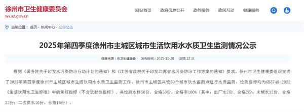 根据《国务院关于印发水污染防治行动计划的通知》和《江苏省政府关于印发江苏省水污染防治工作方案的通知》要求,徐州市卫生健康委组织完成了2025年第四季度徐州市主城区城市生活饮用水水质卫生监测工作。徐州市主城区共设50个城市饮水监测点进行水质监测,检测指标均为GB5749-2022《生活饮用水卫生标准》中的常规指标(不含放射性指标)。共检测水样50份,合格50份,合格率100%(其中:出厂水2份、合格2份;末梢水32份、合格32份;二次供水16份、合格16份)。
