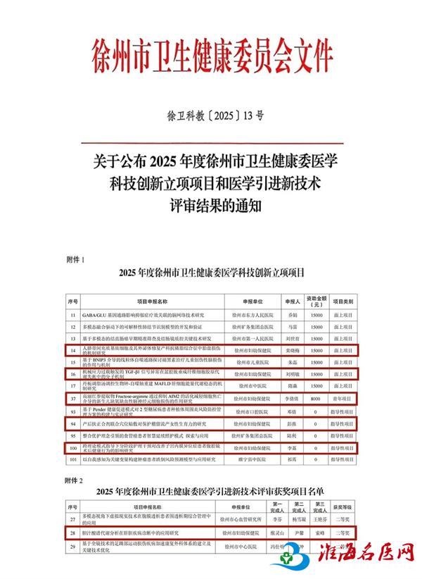喜报频传,硕果盈枝!近日,徐州市妇幼保健院在2025年度徐州市卫生健康委医学科技创新项目申报和医学引进新技术评估工作中表现优异,共有5个项目获批立项,并获评1项医学引进新技术二等奖。这一成绩的取得,离不开市卫健委科教处长期以来对医院科研工作的指导和支持,充分彰显了我院在政策引导下不断提升的科研创新实力与临床技术应用水平。