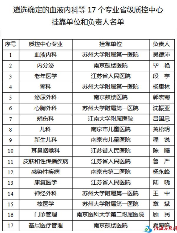 遴选确定的血液内科等17个专业省级质控中心挂靠单位和负责人名单