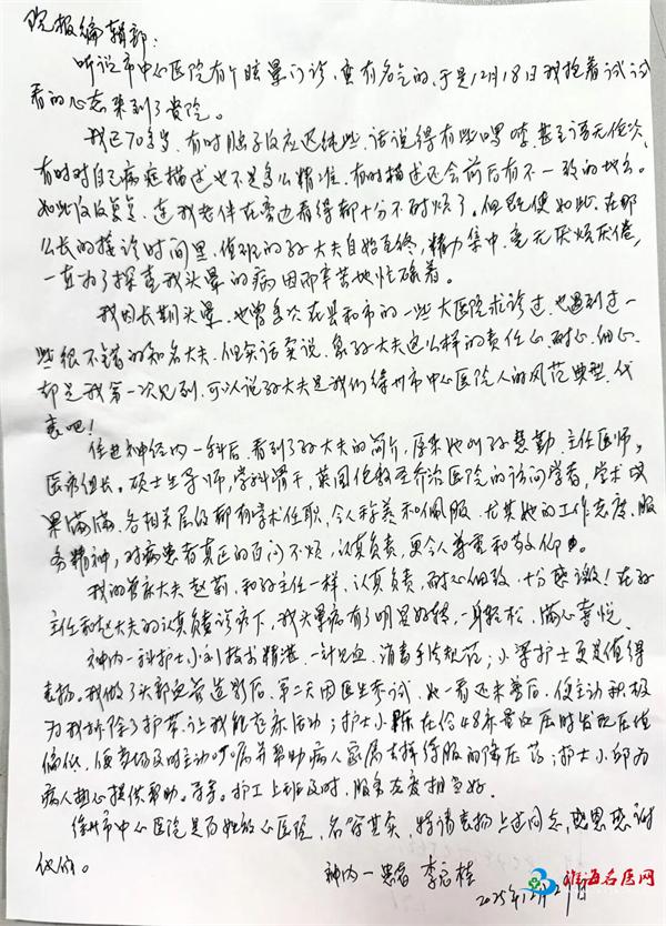 近日,徐州市中心医院院报编辑部收到了一封来自神经内科一病区七旬患者李启桂的感谢信。信中讲述了她因长期头晕在我院住院治疗,在医护人员的耐心诊疗与悉心照料下症状明显好转的经历,字里行间满是对神经内科一病区医护团队的感激与赞扬。