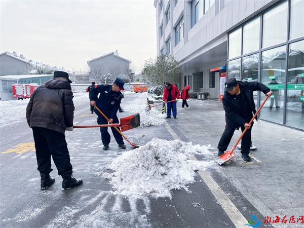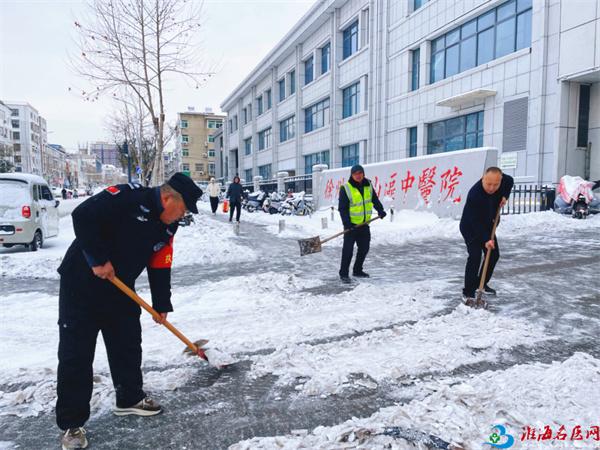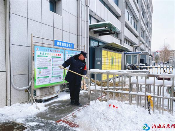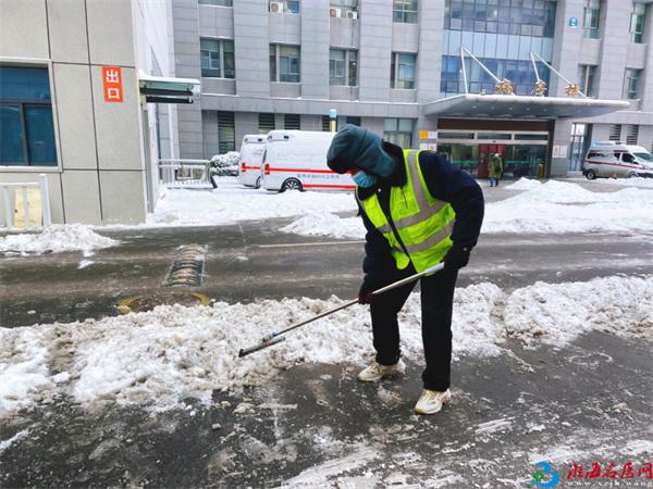 簌簌扫雪声、铿锵铲冰声,在寂静的晨雪中交织成最动人的旋律,他们的身影在白雪映衬下愈发挺拔,额头的汗珠凝结成霜,裤脚的冰碴冻成硬块,却始终没有一人停下脚步。从门诊楼前到住院部通道,从院区主干道到便民小径,他们用双手一点点扫清积雪、铲除坚冰,为就诊患者、医护人员铺就了一条安全通畅的暖心之路。