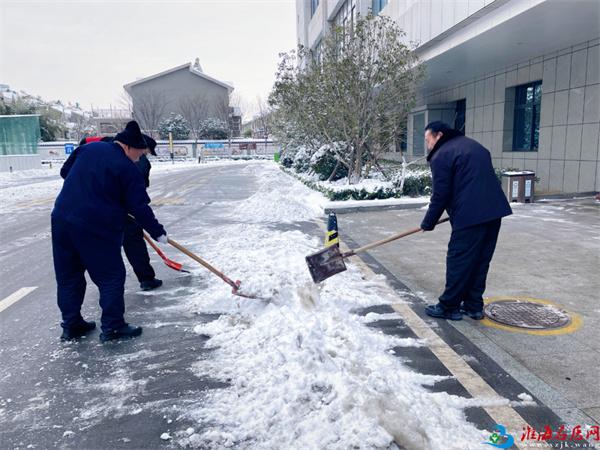 朔风刮过脸颊,雪粒沾湿衣领,他们却浑然不觉,刘科长带头冲锋在前,挥锹铲雪、躬身清冰,动作干脆利落;他们分工协作,扫帚翻飞、铁锹起落,积雪被一一清扫至路边;保洁员们格外细心,重点排查台阶、坡道、连廊等关键区域,敲碎薄冰、铺整路面,不放过任何一处安全隐患。