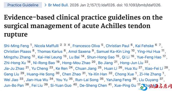2026年1月,由我院骨关节外科病区副主任、运动医学科副主任医师冯仕明、伦敦大学Nicola Maffulli教授联合全球40余个医疗中心的运动医学与足踝外科专家共同制定的《急性跟腱断裂手术治疗循证临床实践指南》,在国际权威期刊《British medical bulletin》(JCR 1区,IF影响因子:5.4)正式发布,据网络搜索,这是目前国际上第一部专注于急性跟腱断裂外科治疗的循证指南。