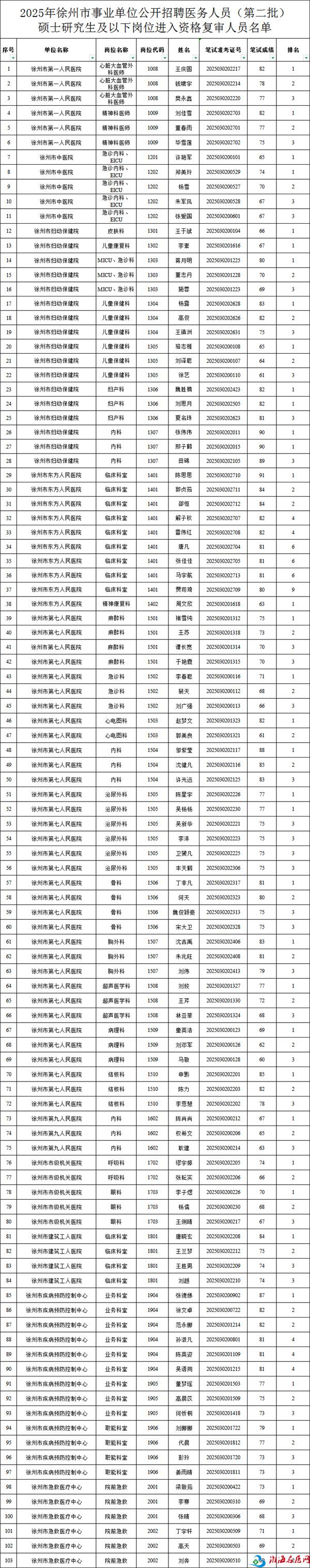 2.硕士研究生及以下岗位:2025年徐州市事业单位公开招聘医务人员(第二批)硕士研究生及以下岗位笔试合格分数线为60分,在报考各岗位笔试成绩合格人员中,从高分到低分的顺序,按不超过招聘岗位计划数1:3的比例确定参加资格复审的人选(末位成绩并列的,一并参加),进入资格复审人员名单详见附件2。