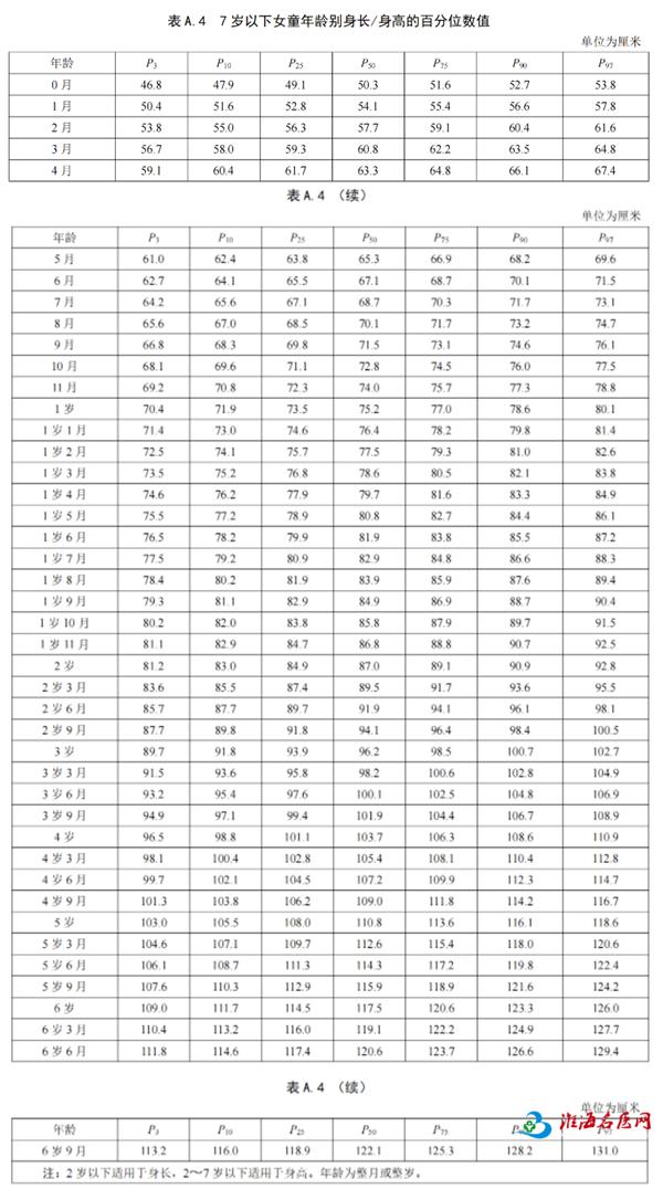 儿童身高发育 自测对照表(0–18岁)