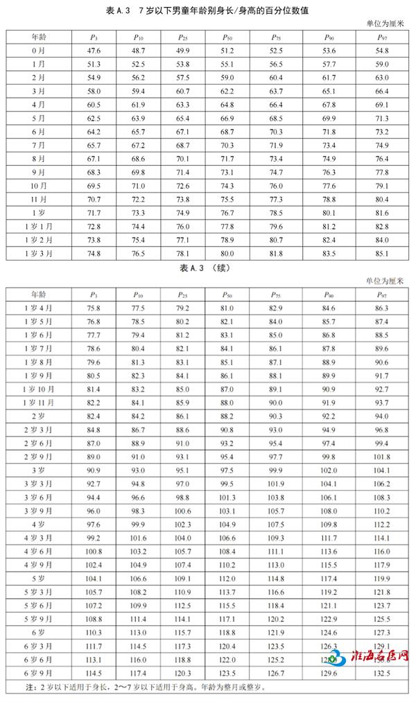 0–7岁男童身高发育百分位数值参考表
