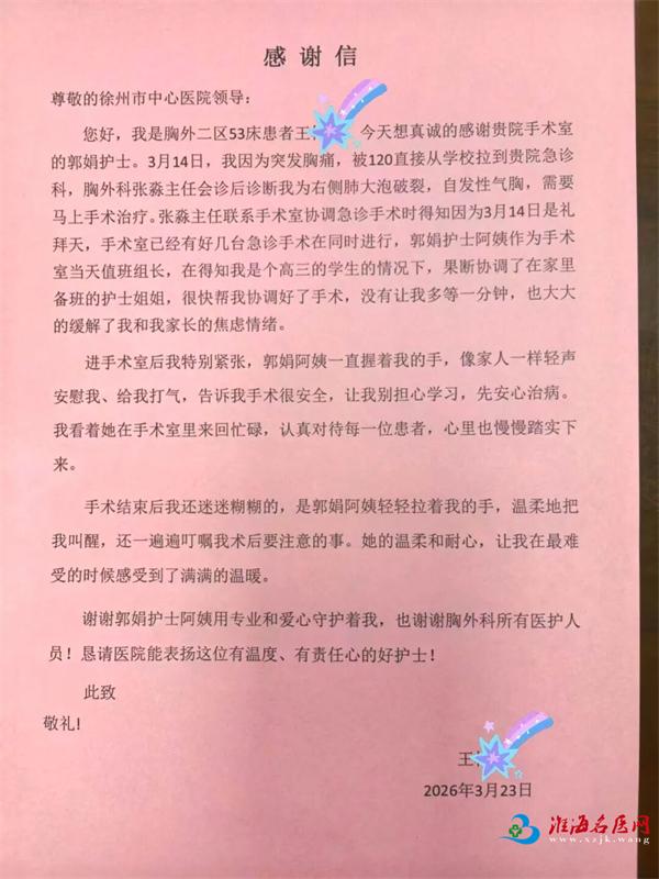 近日,徐州市中心医院收到一封来自“胸外二区53床患者王同学”的感谢信,字里行间满是对手术室郭娟护士及胸外科张淼医护团队的感激之情。信中,王同学讲述了自己突发疾病后,在医院得到及时救治与暖心关怀的经历,为医护人员的专业与温度点赞。