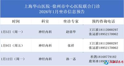 “上海华山医院——徐州市中心医院联合门诊”2026年1月份神经内科专家坐诊信息预告