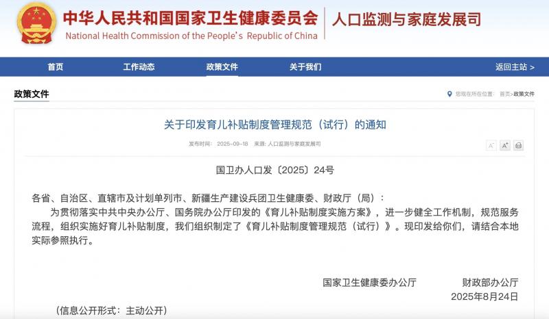 国家卫生健康委、财政部印发《育儿补贴制度管理规范(试行)》